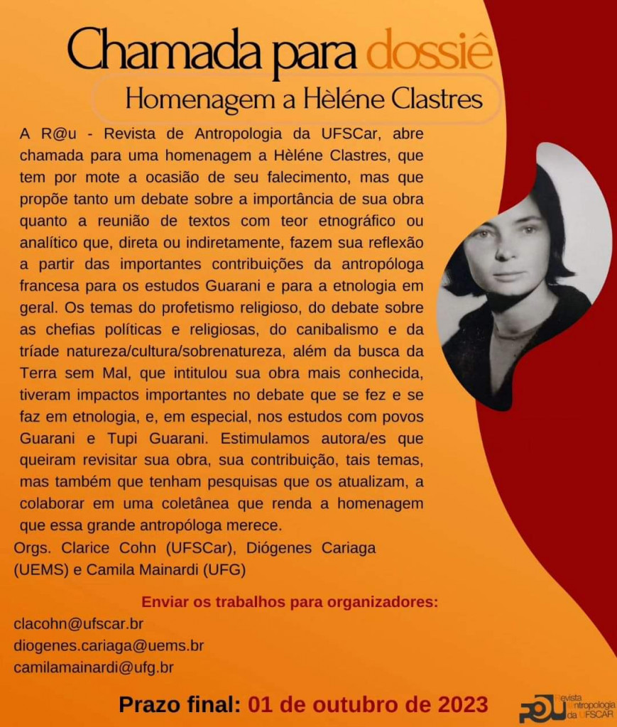 A R@U – Revista de Antropologia da UFSCar, abre chamada para uma homenagem a Hélène Clastres, que tem por mote a ocasião de seu falecimento, mas que propõe tanto um debate sobre a importância de sua obra quanto a reunião de textos com teor etnográfico ou analítico que, direta ou indiretamente, fazem sua reflexão a partir das importantes contribuições da antropóloga francesa para os estudos Guarani e para a etnologia em geral. Os temas do profetismo religioso, do debate sobre as chefias políticas e religiosas, do canibalismo e da tríade natureza/cultura/sobrenatureza, além da busca da Terra sem Mal, que intitulou sua obra mais conhecida, tiveram impactos importantes no debate que se fez e se faz em etnologia e, em especial, nos estudos com povos Guarani e Tupi Guarani. Estimulamos autora/es que queiram revisitar sua obra, sua contribuição, tais temas, mas também que tenham pesquisas que os atualizam, a colaborar em uma coletânea que renda a homenagem que essa grande autora merece.
